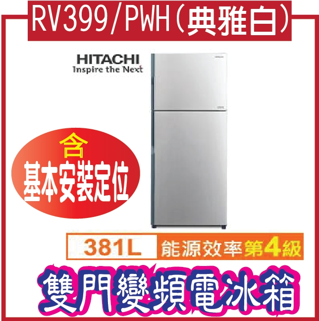 HITACHI 日立381L雙門變頻電冰箱RV399/PWH(典雅白) 68349加碼送【基本安裝定位】HITACHI 日立381L雙門變頻電冰箱RV399/PWH(典雅白) 17,999