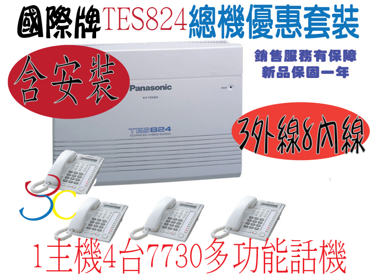 TES824-1標準安裝27945加碼送【1主機4話機標準安裝一般30坪大小限刷卡匯款方式結帳後2派工安裝(限桃園,台北,基隆)】-1 豪華套裝 TES01B TES824豪華套裝TES-824主機1台(實裝308),7730螢幕話機4台,來電顯示卡1片 24,566