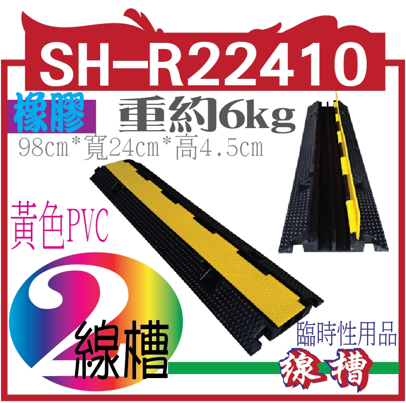 SH-R22410橡膠2槽線槽 66605SH-R22410橡膠2槽線槽 橡膠材質,黃⾊PVC蓋板 整體約 ⻑98㎝*寬24㎝*⾼ 4.5 ㎝,重約6kg內槽尺⼨:約 3㎝*3㎝##臨時性⽤品非取代路⾯埋設管線⾼壓⼒使⽤## 332029992,769