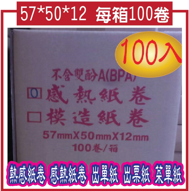 :收銀機紙捲用.... 57*50*12 每箱100卷 x 超值組合 熱感紙卷 感熱紙卷 出單紙 出票紙 菜單紙 (不含雙酚A成份)