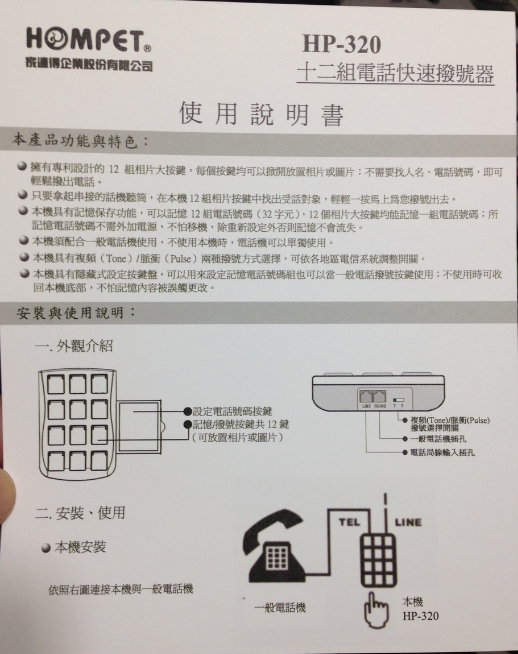 只要將它接上家裡的電話,就可記憶12組號碼,還可自己更換按鍵上的圖片,最適合家中有長輩或是還不會撥號