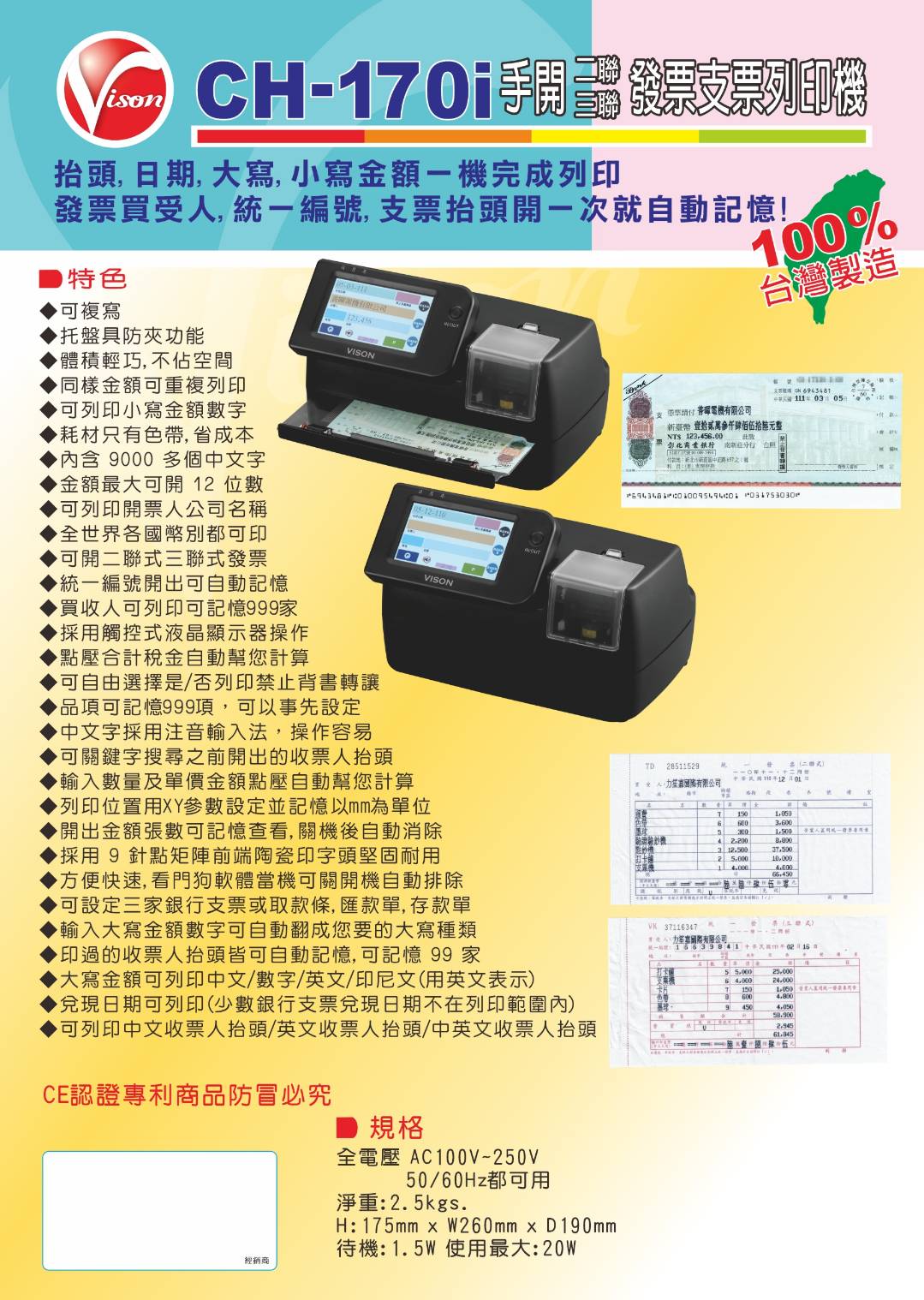 電子(發票用)支票列印機 CH-170i 台灣製造 (不用手寫發票、支票抬頭、日期、金額)