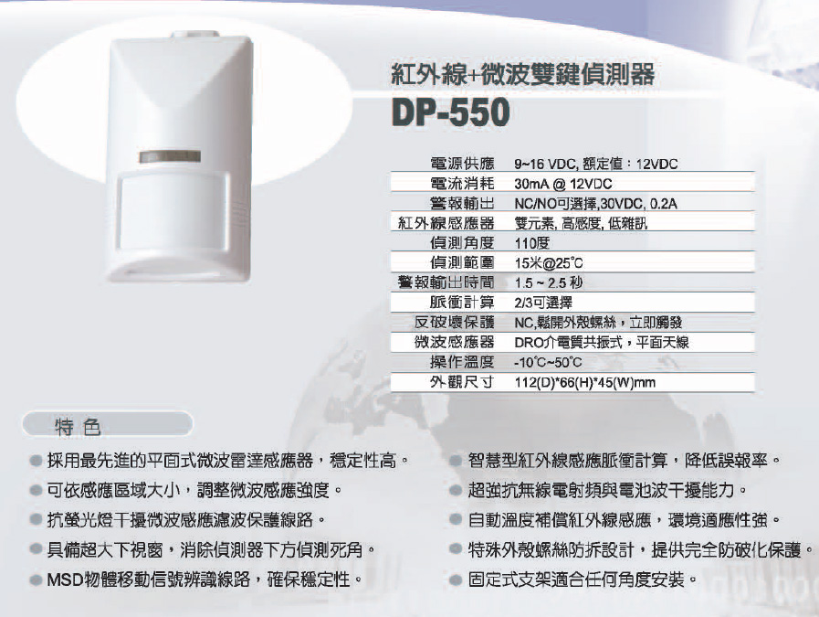 DP-550是一款適合專業保全系統使用的紅外線+微波(PIR+MW)雙鑑偵測器。本產品將兩種不同原理的偵測技術結合成為一體,當兩組感應器同時偵測到入侵者的活動時,才輸出警報信號。因此可有效提高偵測的穩定度,降低誤動作的機率。