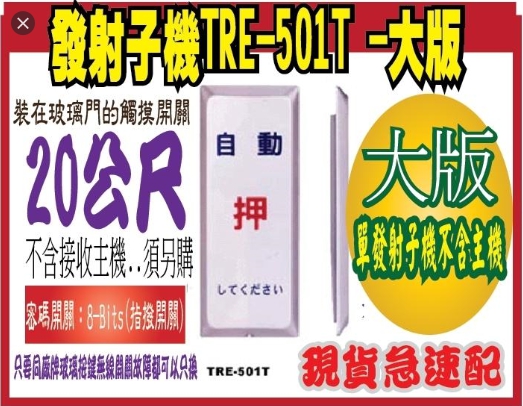 發射子機TRE-501T(大版) 遙控開關 適用:自動門無線觸摸,一般無線開關用(##單發射子機不含主機##)() 78273發射子機TRE-501T(大版) 遙控開關 適用:自動門無線觸摸,一般無線開關用(##單發射子機不含主機##)()開關 適用:自動門無線觸摸,一般無線開關用(##單發射子機不含主機##) 1,359