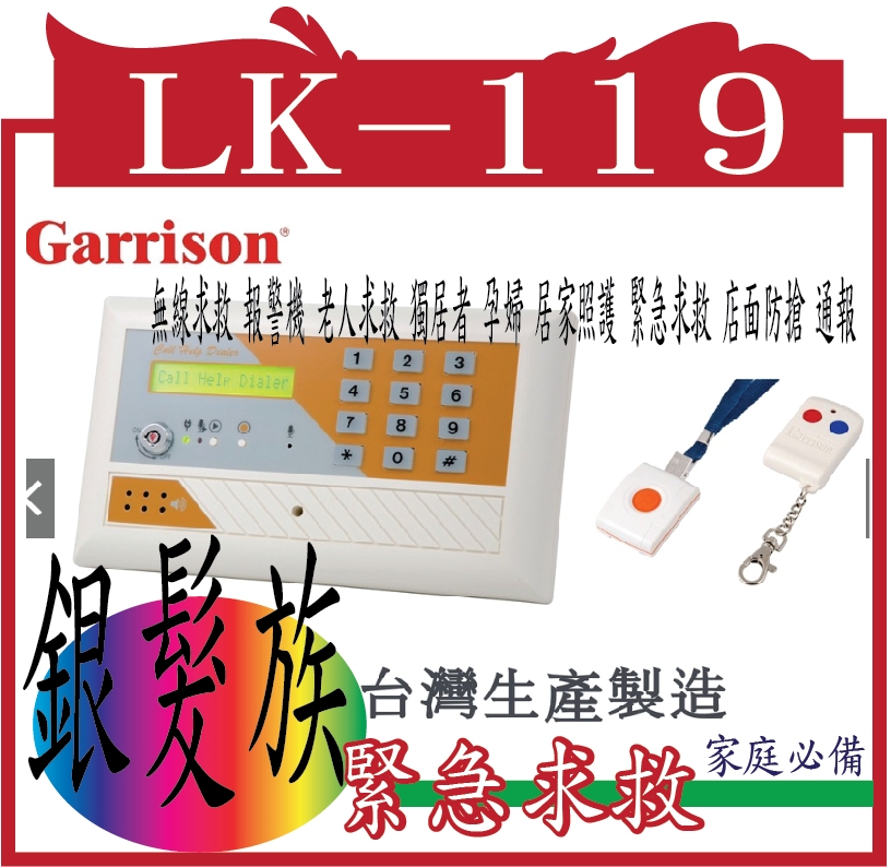 | LK-119 無線求救 報警機 老人求救 獨居者 孕婦 居家照護 緊急求救 店面防搶 通報 安全 台灣生產製造 | 67086 | LK-119 無線求救 報警機 老人求救 獨居者 孕婦 居家照護 緊急求救 店面防搶 通報 安全 台灣生產製造 | | 4,590 | | 1242 | 現貨供應 |