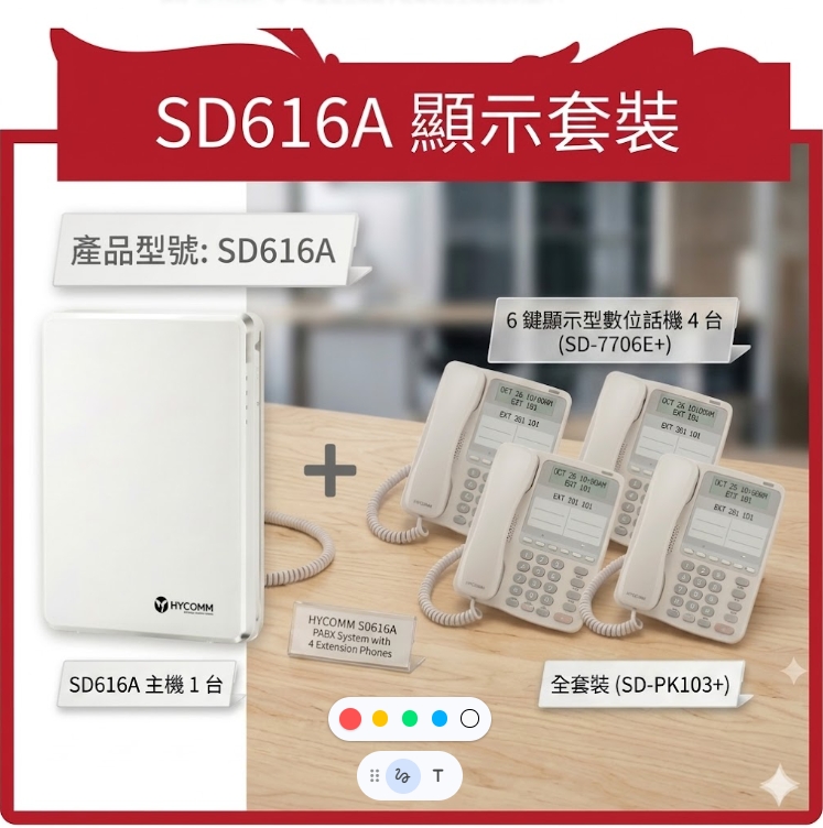 SD-PK103+ SD616A 顯示套裝 616A 主機 1 台、6 鍵顯示型數位話機 4 台 (SD-7706E+)86936SD-PK103+ SD616A 顯示套裝 616A 主機 1 台、6 鍵顯示型數位話機 4 台 (SD-7706E+) 18,755
