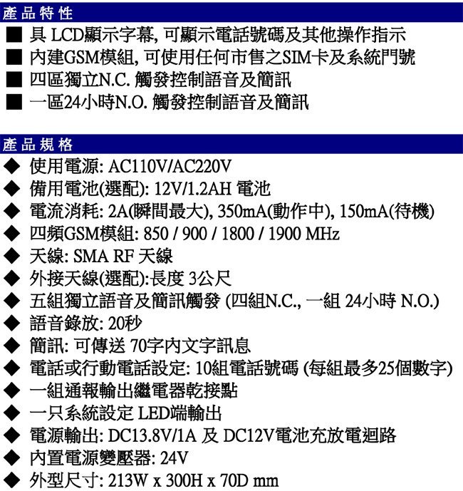 五組獨立語音及簡訊觸發 (四組N.C.,一組24小時N.O.)