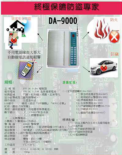 專案限量DA-9000(自動切換市話與大哥大報警)本系統可由外面打電話設定或解除. 本系統所有感應器皆採用最新雙向設計當門窗沒關好皆會顯示在主機上面板