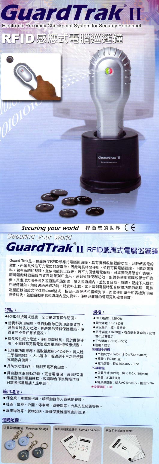 專案限量GuardTrak II RFID感應式電腦巡邏鐘•GuardTrak II(連接PC型)手持機、PC連線座、管理軟體、RS-232線、USB線、主管卡(1)、人員卡(3)、地點卡(10)、