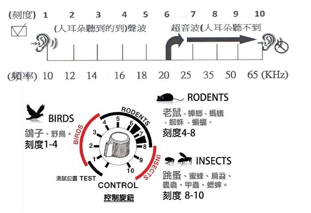 5. 超音波20~65kHz不在人畜聽覺範圍,不傷害人體及寵物;低於20kHz以下之音波,可放置於戶