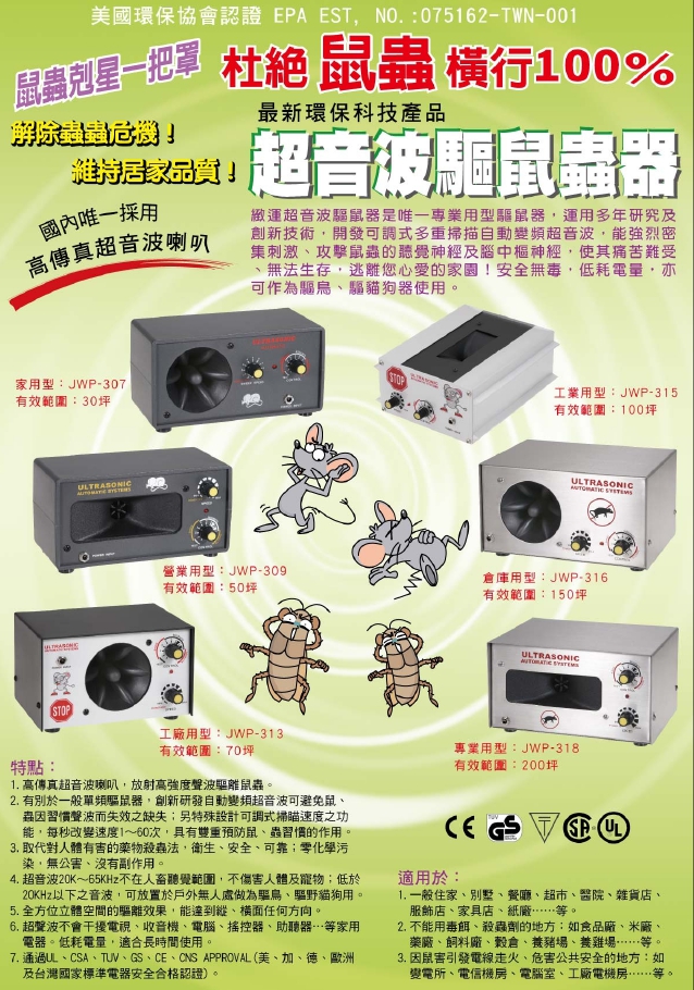 應用超音波驅鼠、蟲由來已久,但對鼠蟲逐漸習慣其音波而失效之缺失,本公司特別潛心研究老鼠生態和蟲類習性,開發設計"多重變調掃描"和"速度密集"強烈刺激,攻擊老鼠、蟲類的知覺神經和腦中樞神經系統,使其痛苦、恐懼、難受兒食慾不振、全身痙攣、繁殖能力降低、無法在此環境下生存而逃離該超音波放射區域。 特點: