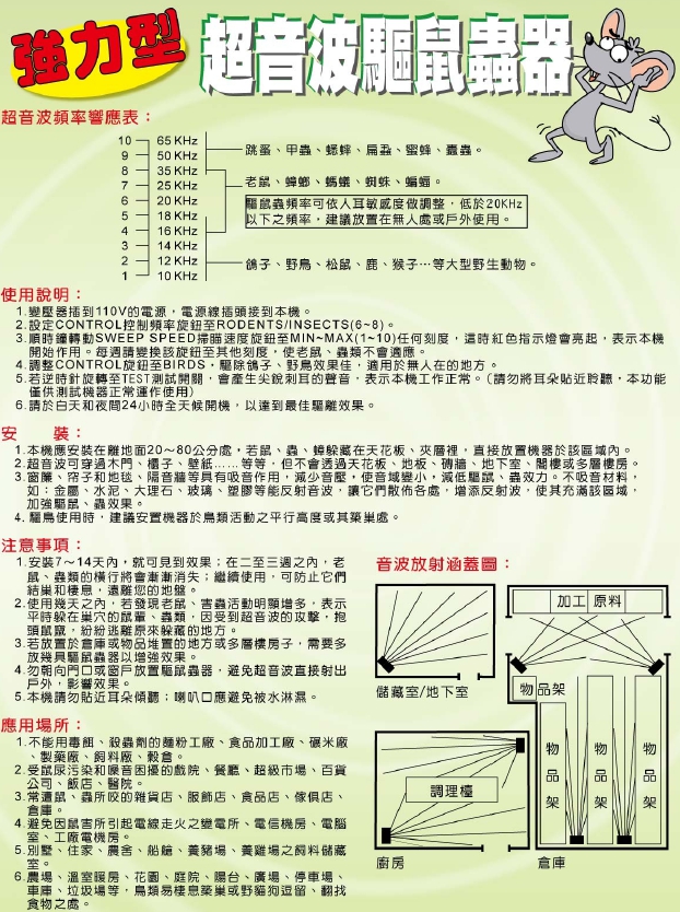 6. 全方位立體空間的驅離效果,能達到縱、橫面任何方向。與一般捕鼠器、藥物殺蟲等定點的驅除