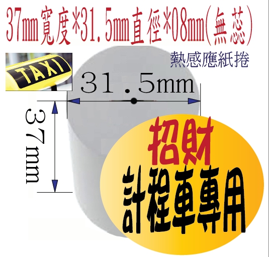 POS熱感應紙捲-->招財計程車新表專用熱感應紙捲37*31.5*08(無蕊)*外感商品查詢代碼:QK63103