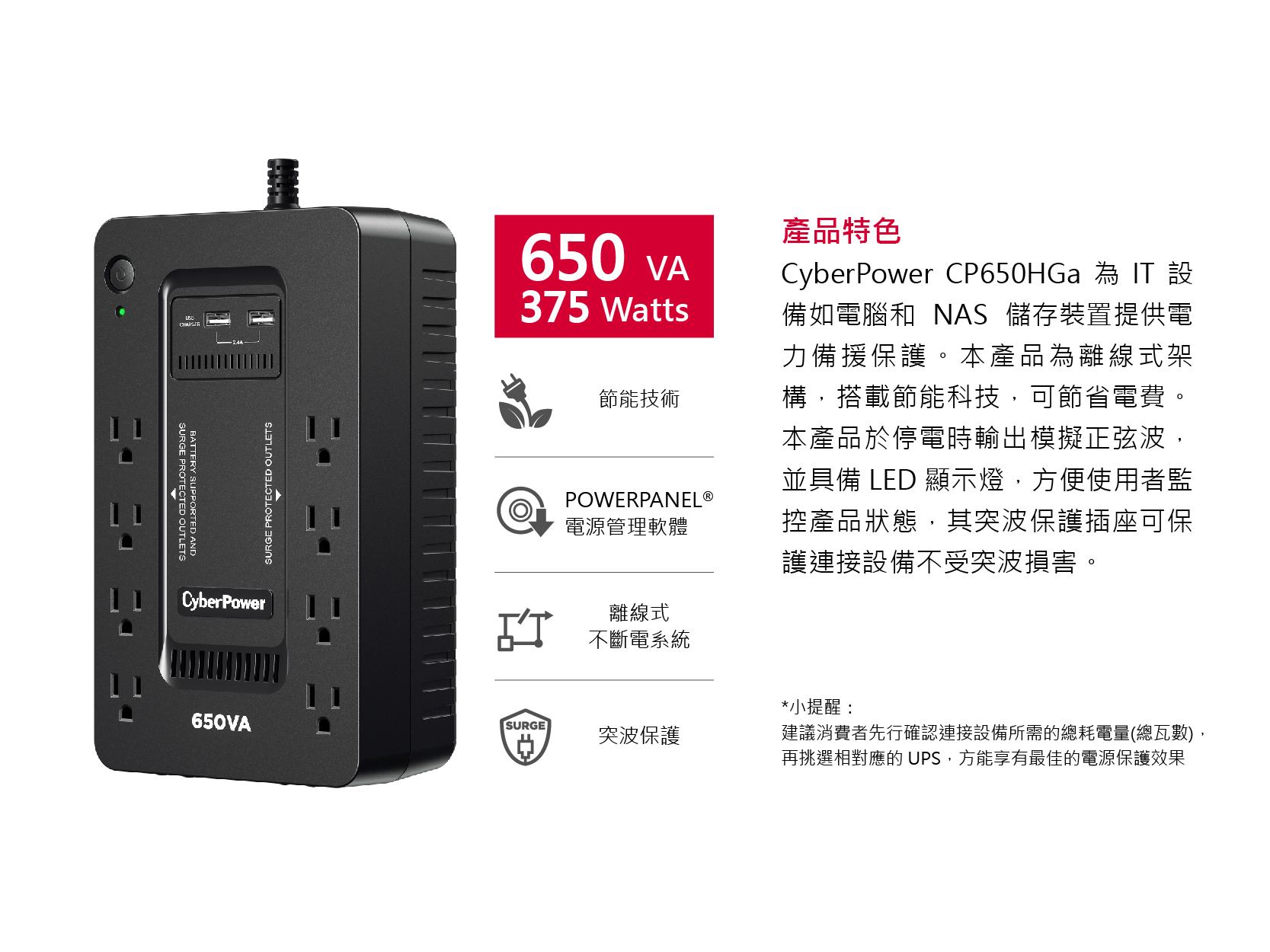 APC-UPS--> CyberPower Standby Series CP650HGa商品查詢代碼:QK69812