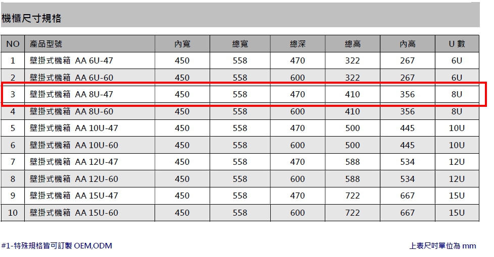 NO 產品型號 內寬 總寬 總深 總高 內高 U 數