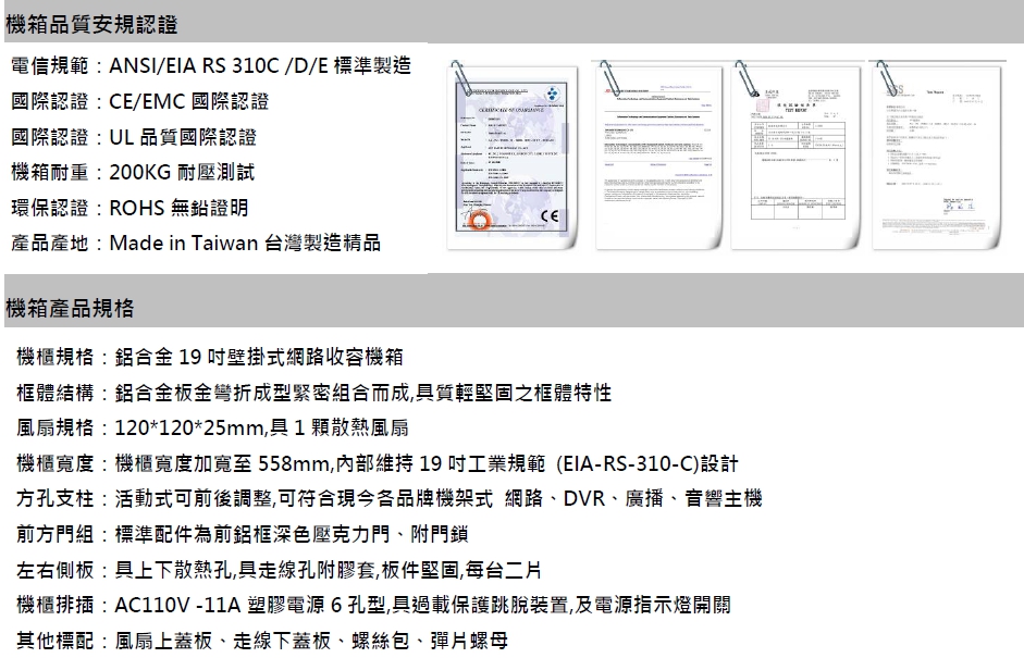 符合國際標準安規,根據國際工規EIA RS 310C-19”製造,機櫃具高散熱設計,避免機櫃過溫導致設備當機損失,