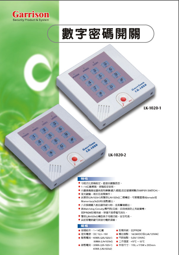 * 雙控(LK-1020-2)機型具子母碼特性,安全性高。