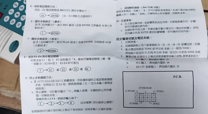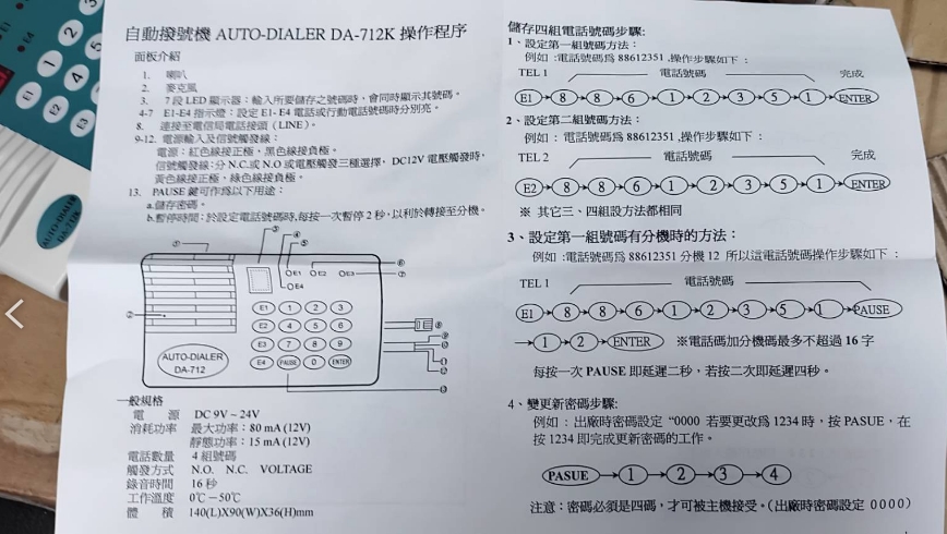 專案限量DA-712-K 警報自動撥號器 當有火災警報時就會啟動自動撥電話,也可搭配所有有線防盜系統接乾接點,或由電壓觸發自動撥電話報警,讓你居家安全在第一時間得到保障。