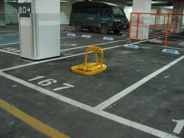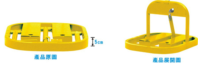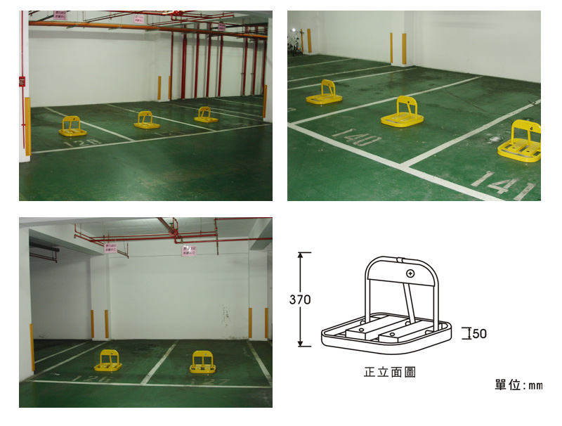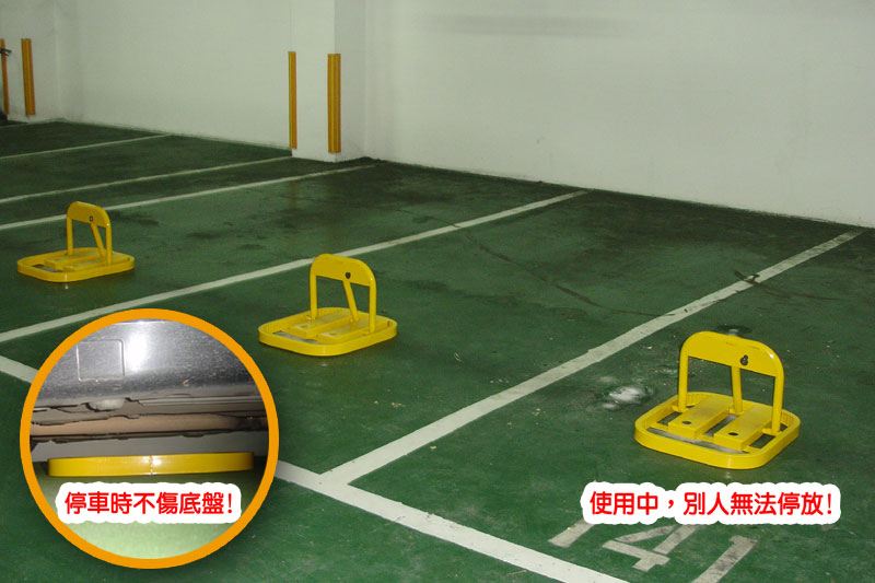 如圖示安裝於停車格上可防止車位遭他人占用 顏色為辨識度較佳的鮮黃色 每個車位附原廠要鑰匙3把.採半自動方式使用.車位鎖站立時只需輕輕的將車位鎖拉起即可自動上鎖.車位鎖解除躺下時需要用原廠鑰匙開啟即可.多折面結構.經測試此款車位鎖最為耐撞.這一款車位鎖的能見度相當高.