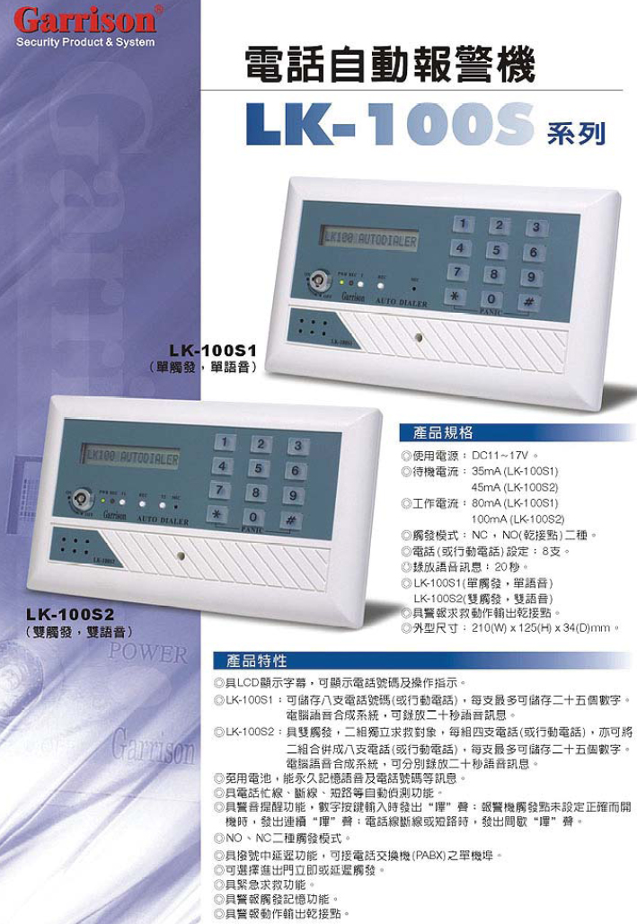 | : 自動報警機-->LK-100S2商品查詢代碼:QK32247 | |||||||||||