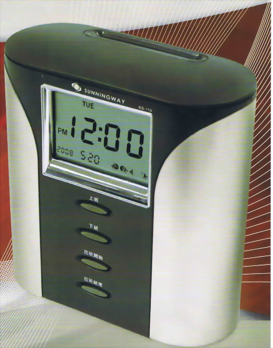 ∼SUNNINGWAY智慧型電腦打卡鐘 KS-110∼LCD顯示的打卡鐘有多種功能『萬年曆』『美妙音樂』『星期顯示』『報時音量、音樂設定』『年、月、日顯示』『四位數密碼設定』;讓您的員工不用天天自己寫卡,使用多功能打卡機,既方便又實用。