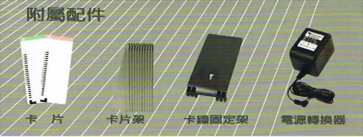 ●商品配件:卡鐘1台、卡片1包、卡片架10人份、卡鐘固定架1個、電源轉換器1個