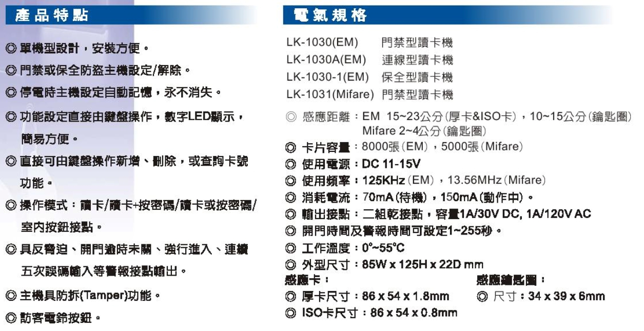 | 專案限量感應式讀卡機 LK-1030/(EM)感應式讀卡機 門禁或保全防盜主機設定/解除 (8000用戶) | ||||||||||||||