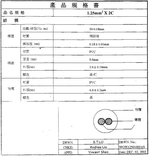 1.25mm平方*2C 電源電纜線