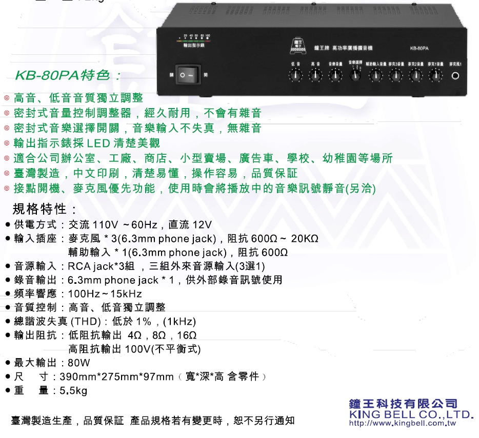 鐘王PA擴音系統-->KB-80PA/無SW商品查詢代碼:QK42733
