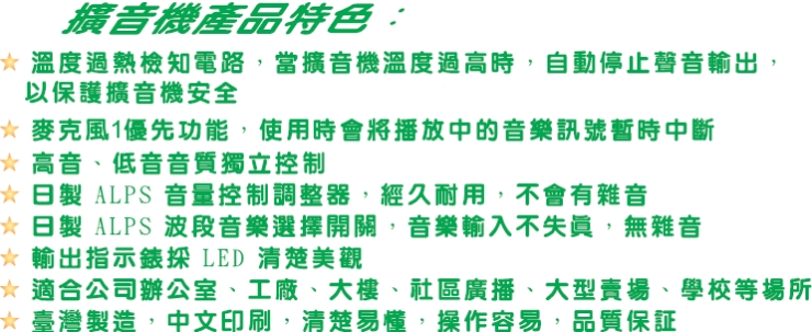 ♦ 溫度過熱檢知電路,當擴音機溫度過高時,自動停止聲音輸出,以保護擴音機安全
