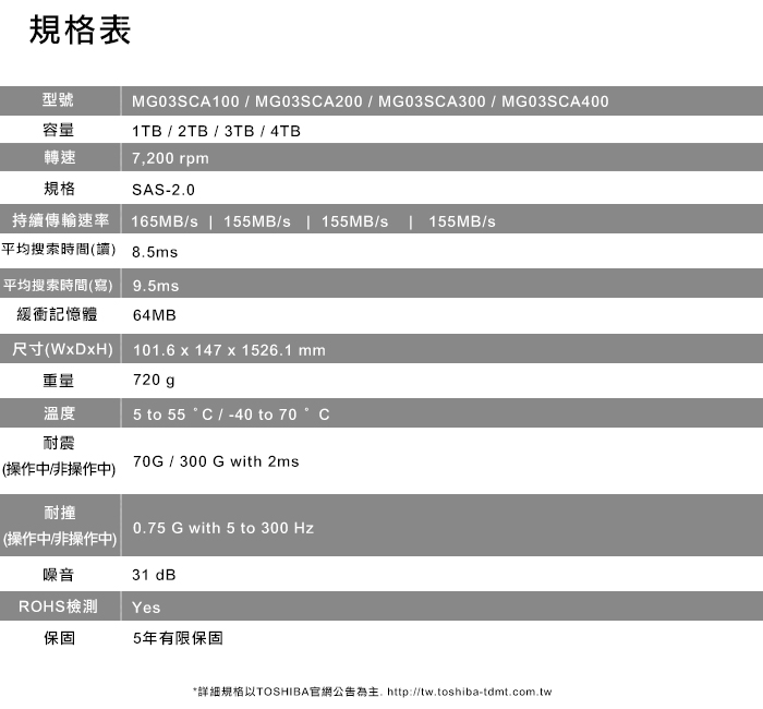 MG03SCA200 [ [企業級] TOSHIBA Harrier系列 3.5吋 SAS 2TB 7200轉 (MG03SCA200)
