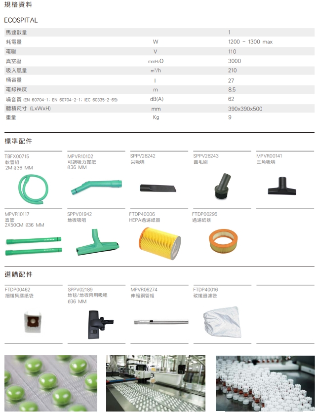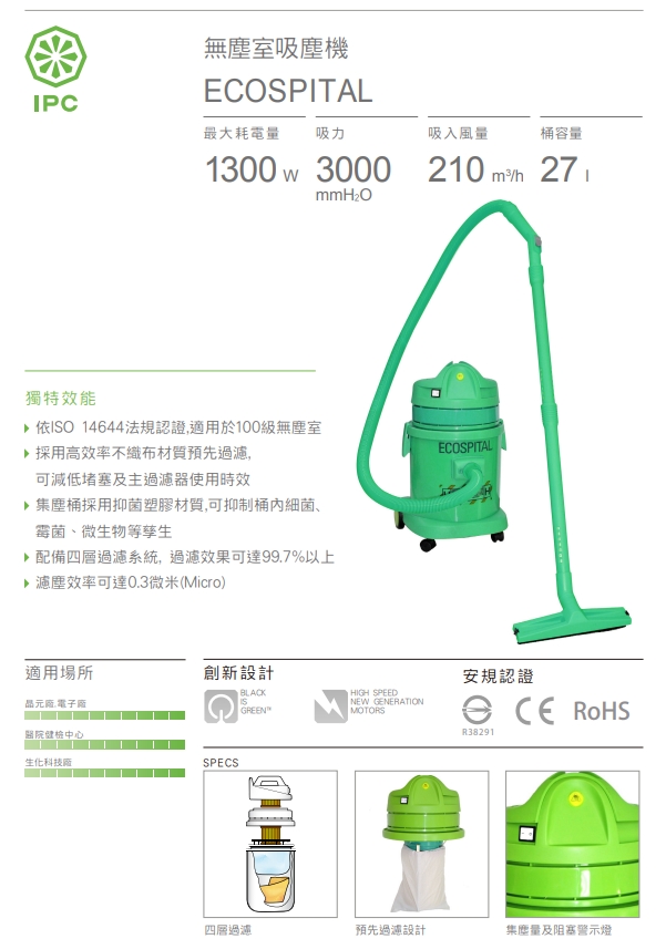 無塵室粉末專用吸塵器(自動逆吹)-->義大利ECOSPITAL 27公升乾用吸塵器 商品查詢代碼:QK59874