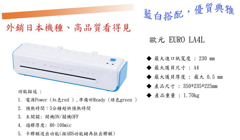 歐元護貝機-->EURO 歐元 A4高品質護貝機 ( LA4L )商品查詢代碼:QK60731
