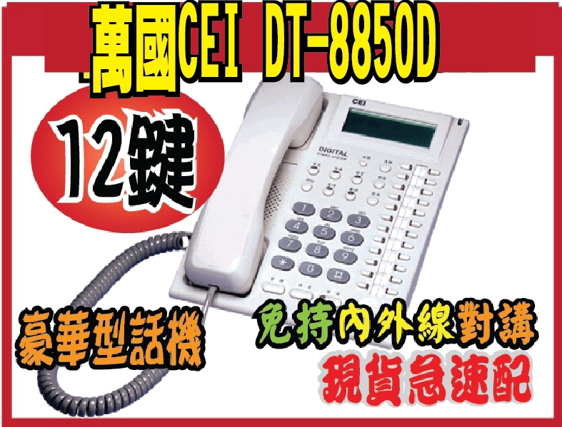 萬國CEI DT-8850H 專業型話機12鍵顯示型話機 內線可免持對講外線免持對講,研發團體自行研發高科技通訊產品,目前之通訊產品已整合有線、無線、數據及語音相關設備,突破僅企業使用的範疇,適用於任何場所,除穩定的通訊品質,更發揮通訊系統高效率的功能。