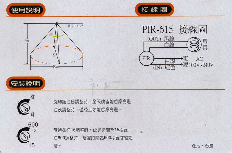 1.旋轉鈕往太陽符號調整時,全天侯皆能感應亮燈;往月亮符號調整時,僅晚上才能感應亮燈。