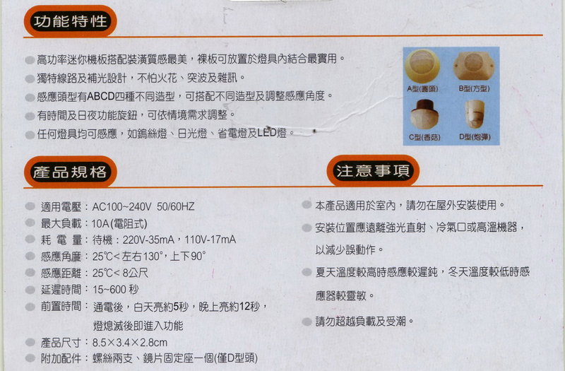 4.任何燈具均可感應,如鎢絲燈、日光燈或省電燈。