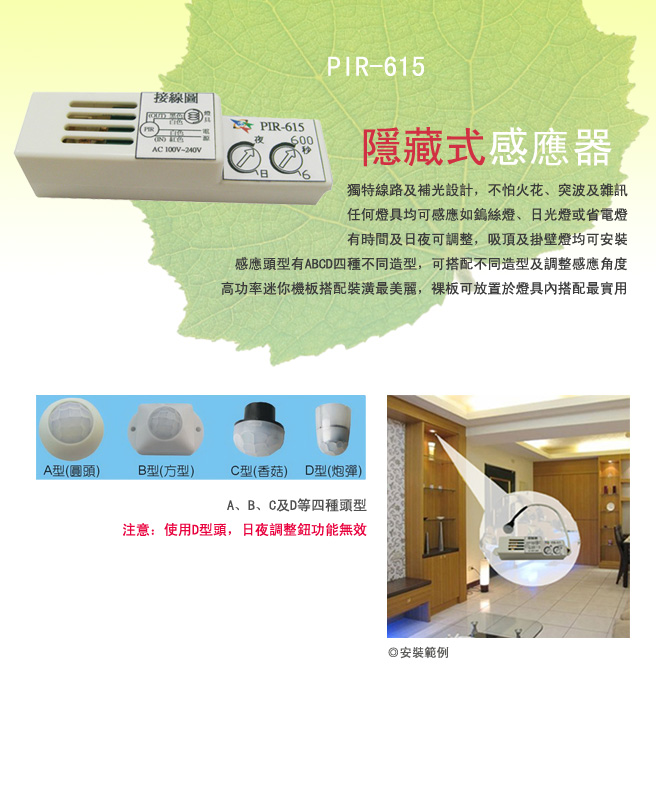 1.型 號: PIR-615 隱藏式感應器