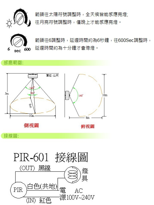 4. 有時間、日夜及距離等三種功能可調整,吸頂、掛壁均可安裝。