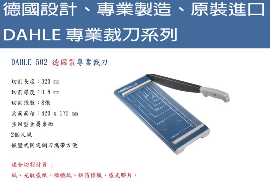 德國DAHLE 502 A4裁紙器向左移動 向右移動 502 德國製專業裁刀 切割長度: 320 mm 切紙厚度: 0.8mm 切紙張數: 8張 桌面面積: 420x175mm |
