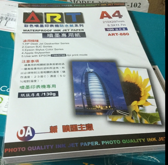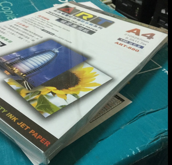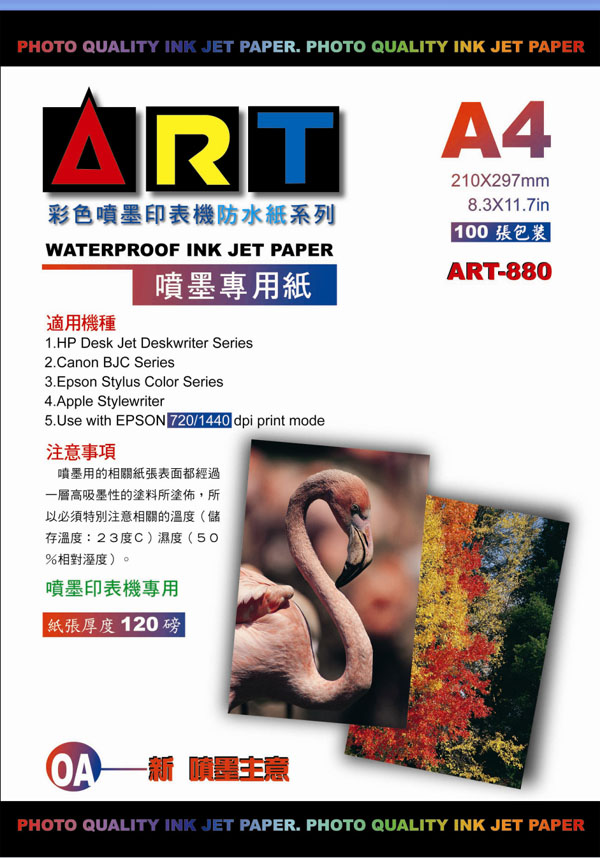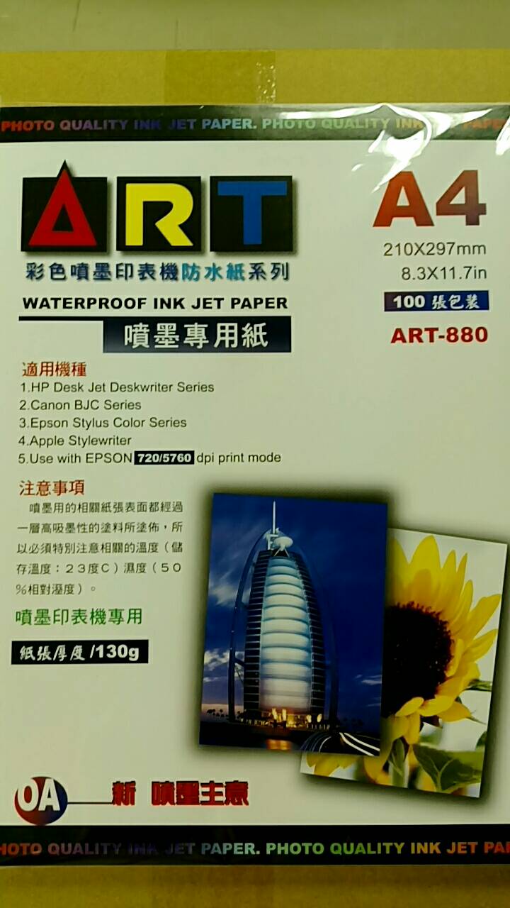 ART-880*22/箱噴墨防水紙 ( 720~5760DPI ) ART-880 防水噴墨專用紙 A4 / 120 磅 100張 / 包 (22包/箱) |