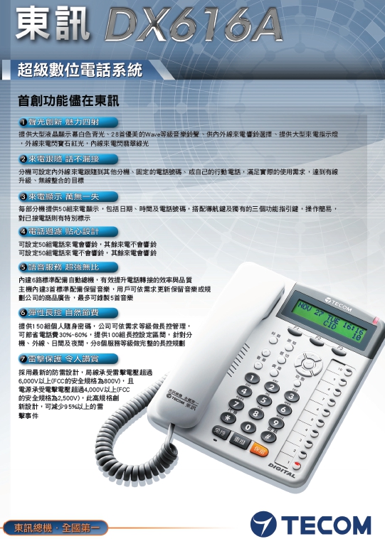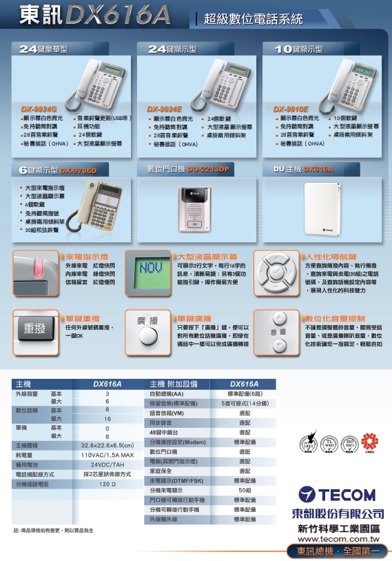 專案限量總機電話.東訊DX-616A主機x1台(可接3外8內)顯示話機DX-9906Ex4台