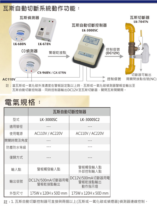 LK-3000SC2: 警報觸發輸入點/外部控制輸入點控制自動關閉瓦斯開關閥, 防止瓦斯爆炸或