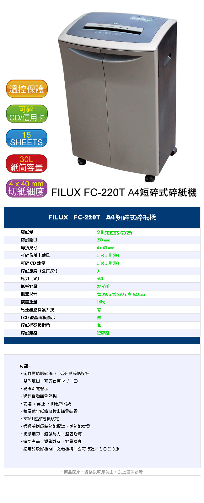 FILUX FC-220T A4短碎碎紙機FILUX FC-220T A4短碎碎紙機