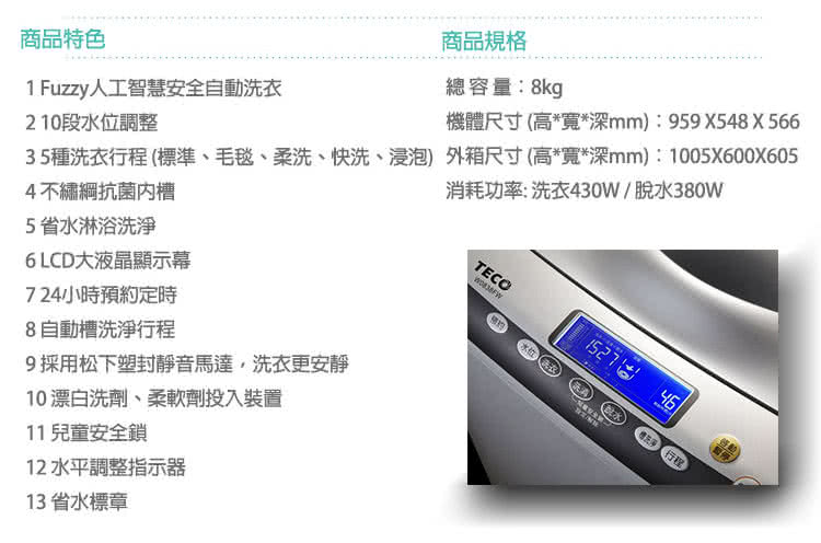 型號:【TECO東元】8公斤省水標章單槽洗衣機(W0838FW)