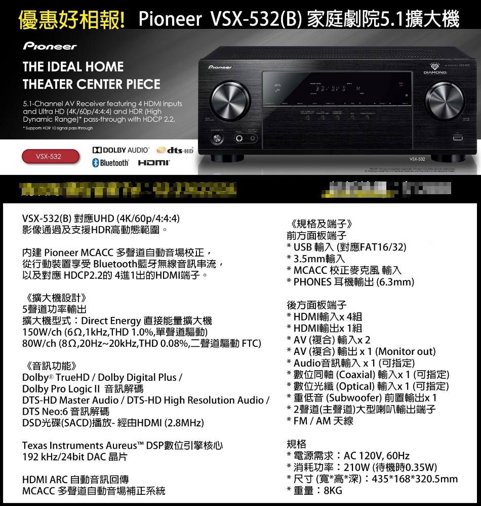 | 型號:先鋒 Pioneer VSX-532 5.1聲道 AV 環繞擴大機 供貨狀況: | |||||||||||