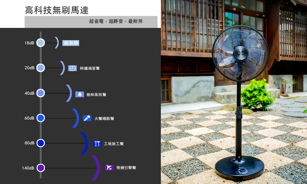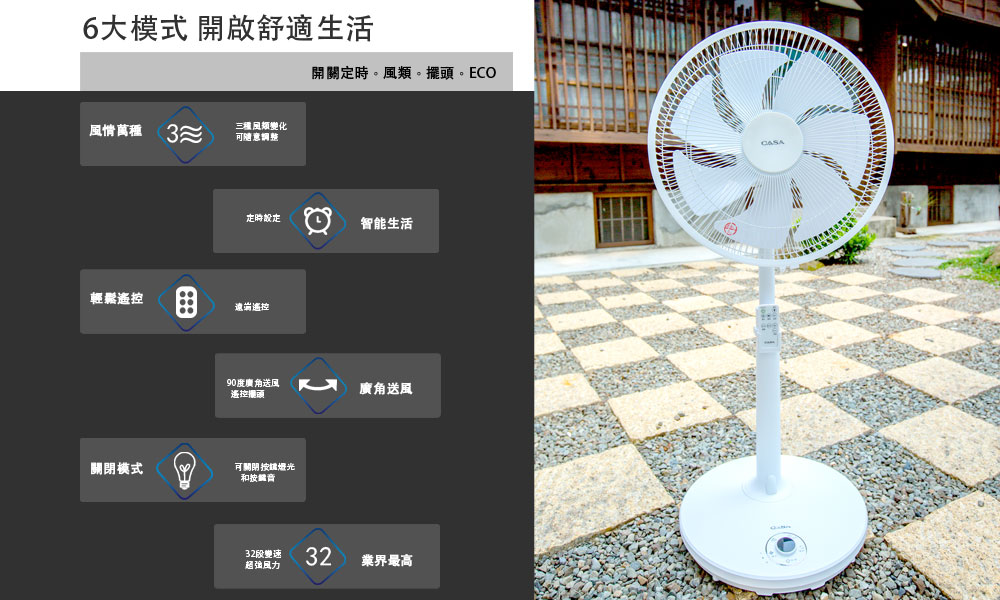 • DC直流靜音馬達 • 九段變速 • 新5枚扇葉 • ECO溫度感知 • 無線遙控功能 • 1-9小時定時關機