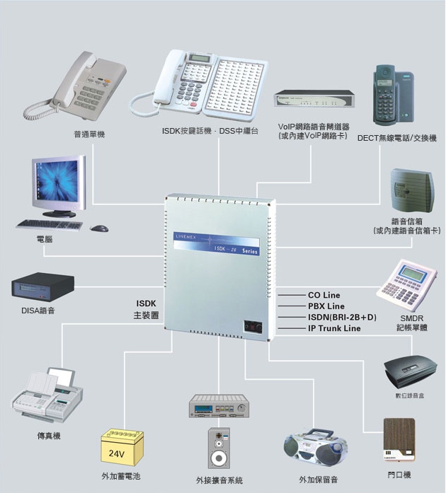 內外線門數可彈性擴充,能將ISDK-26由2條外線16線分機擴充到10條外線,內線機擴充至48線分機,以符合用戶的需求。