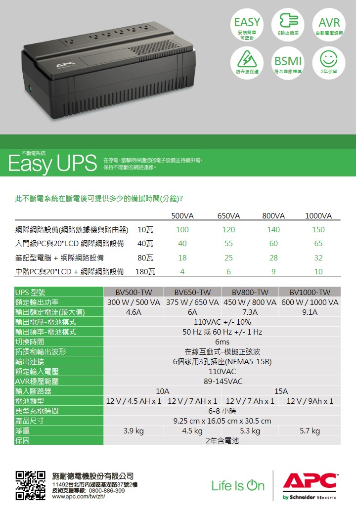 型號: APC BV1000-TW 在線互動式不斷電系統