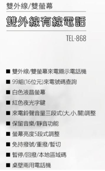雙外線電話機 -->台灣三洋SANLUX 雙外線/雙螢幕來電顯示電話機 TEL-868 白色液晶螢幕 紅色夜光字鍵 99組來電查詢商品查詢代碼 : QK69375
