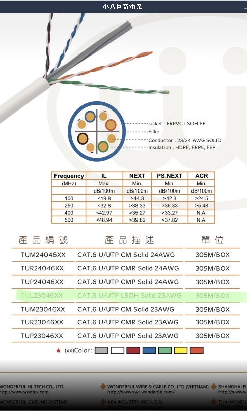 型號:WONDERFUL萬泰CAT.6 C6 LOSH 【305米 / 箱】純銅A級網路線 是23AWG